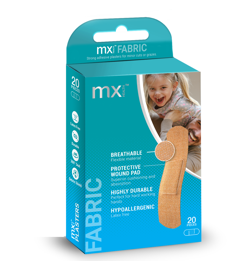 The mx Health Fabric Strip Plasters are meticulously designed for minor cuts, grazes and scalds, featuring a robust adhesive to ensure secure placement. The protective wound pad offers a cushioning effect, enhancing comfort for the injured area. These plasters provide reliable protection against moisture, maintaining their shape and grip even when wet. Hypoallergenic and latex-free, these plasters are suitable for all skin types.
