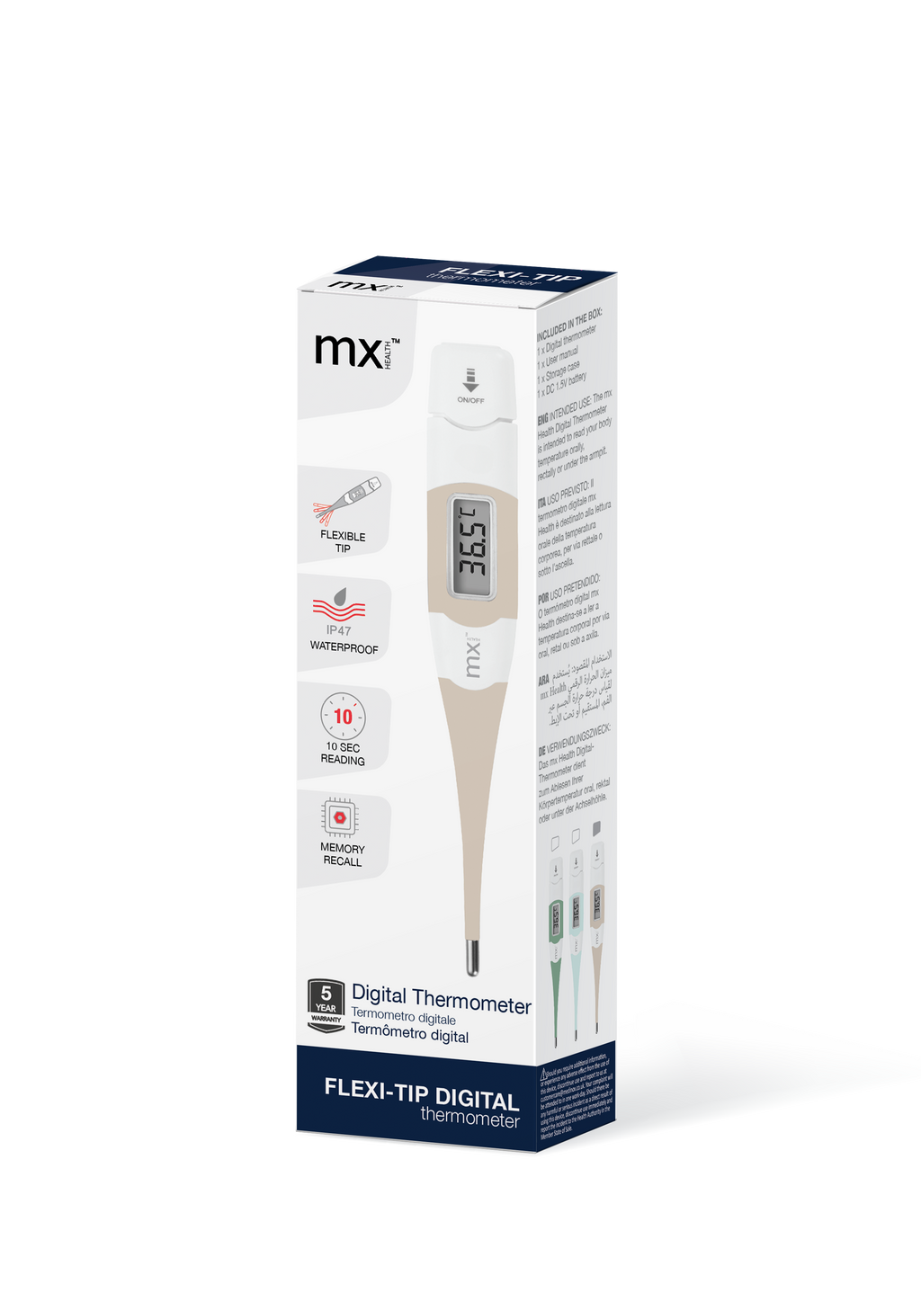 The mx Health Flexi-Tip Digital Thermometer is a reliable and user-friendly device designed for accurate temperature measurement. Featuring a flexible tip, the thermometer ensures a comfortable and safe experience for users of all ages, reducing the risk of discomfort or injury during use. Its digital display provides clear and easy-to-read results within ten (10) seconds, making it an ideal choice for quick and efficient health checks at home.