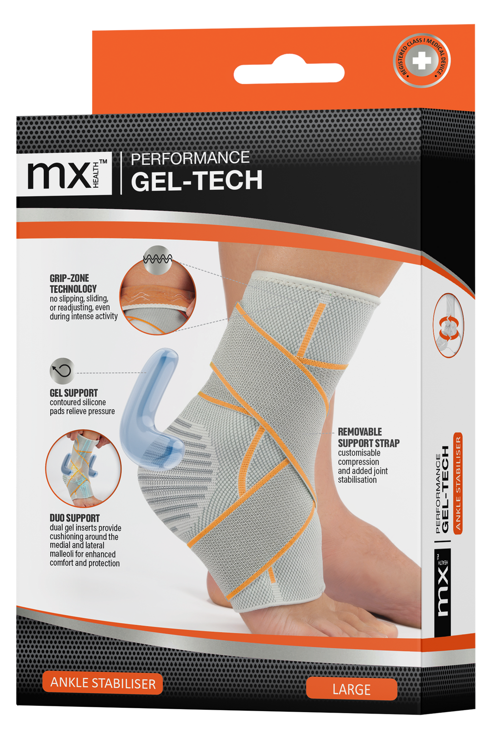 The mx Health Performance Gel-Tech supports range is engineered to deliver advanced joint stabilisation, targeted compression, and enhanced comfort for individuals that require reliable support during physical activity, rehabilitation, or everyday movement. Designed with performance-driven features and premium materials, the range combines anatomical support with modern Gel-Tech technology to promote stability without compromising mobility.