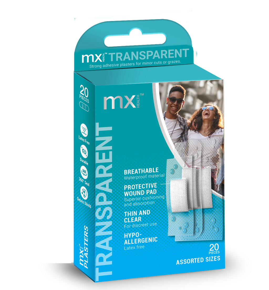 The mx Health Clear Assorted Plasters are meticulously designed for minor cuts, grazes and scalds, featuring a robust adhesive to ensure secure placement. The protective wound pad offers a cushioning effect, enhancing comfort for the injured area. These plasters provide reliable protection against moisture, maintaining their shape and grip even when wet. Hypoallergenic and latex-free, these plasters are suitable for all skin types.