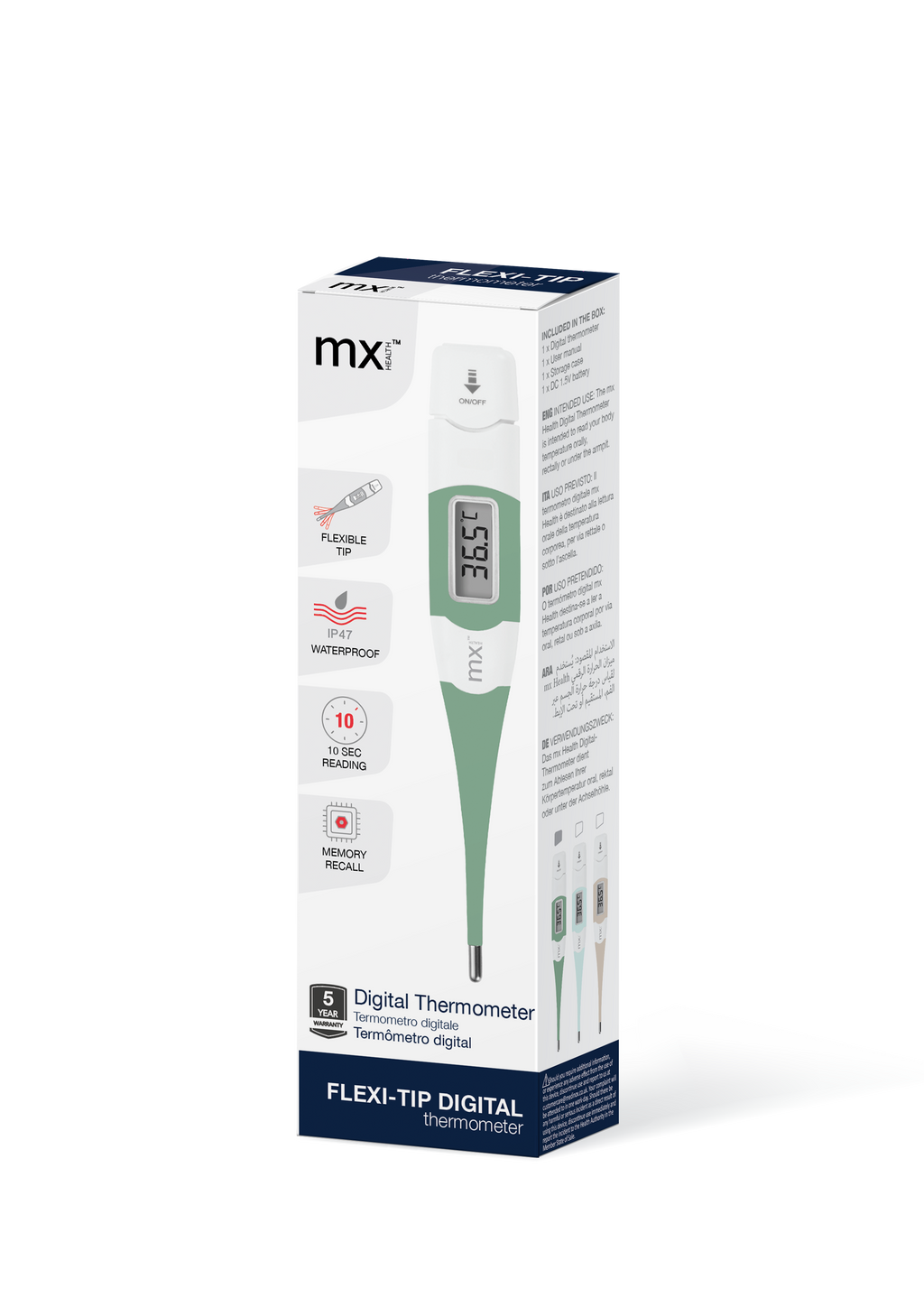 The mx Health Flexi-Tip Digital Thermometer is a reliable and user-friendly device designed for accurate temperature measurement. Featuring a flexible tip, the thermometer ensures a comfortable and safe experience for users of all ages, reducing the risk of discomfort or injury during use. Its digital display provides clear and easy-to-read results within ten (10) seconds, making it an ideal choice for quick and efficient health checks at home.