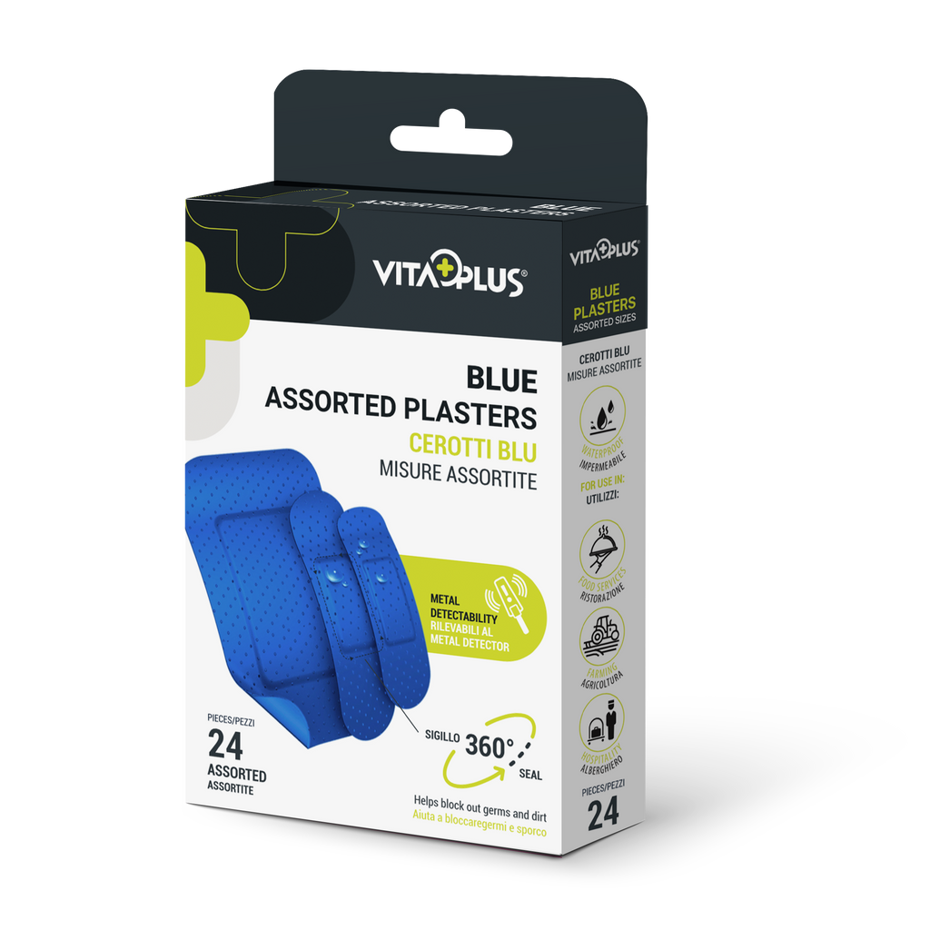 Made with strong adhesive, they stay securely in place, while the water-resistant material ensures protection even in moist conditions. The bright blue colour enhances visibility, reducing the risk of contamination. Comfortable and latex-free, the VitaPlus Blue Plasters are the perfect choice for safe and hygienic wound care.
